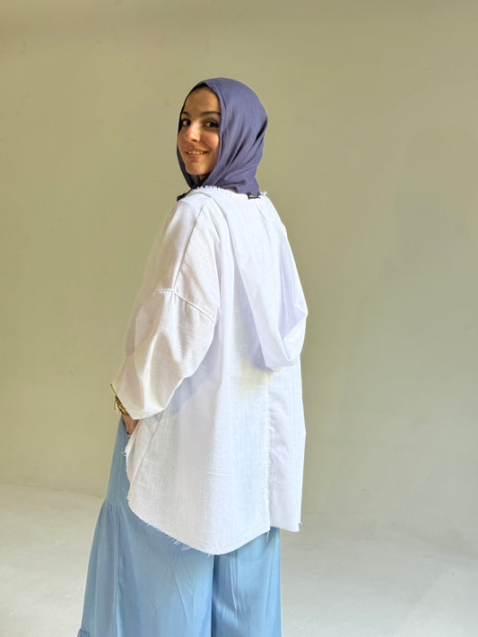 Linen Belted Asymmetrical Shirt in Aqua Blue