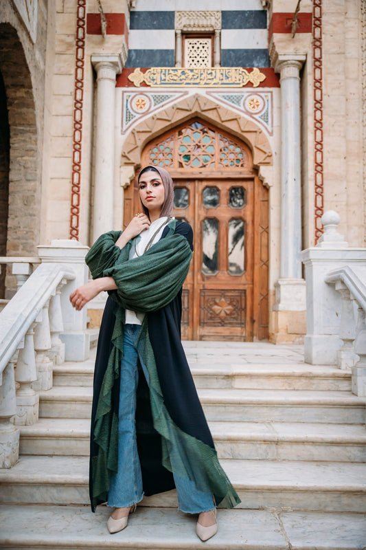 Net puffy sleeves ruffles kaftan in olive
