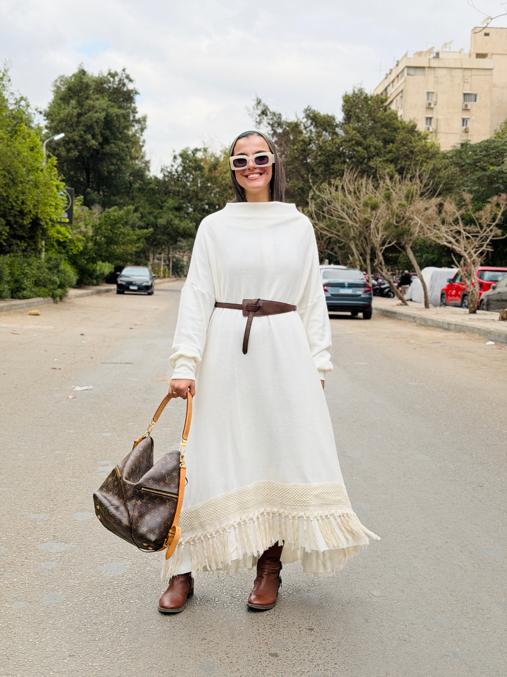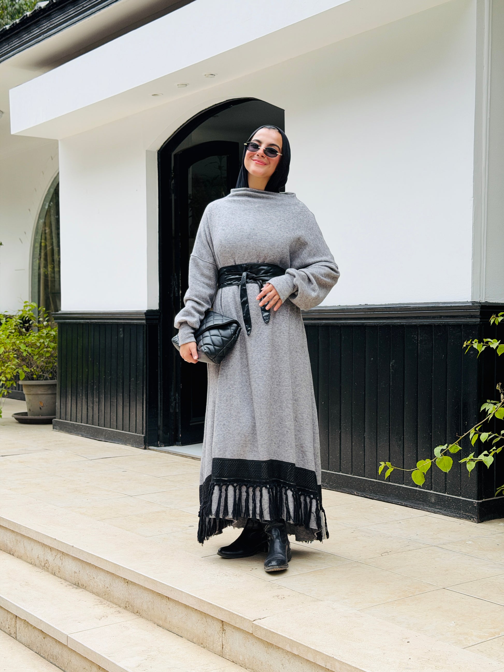 Crafted in a soft Grey tone with a touch of black fringes,this maxi dress features a loose, comfortable fit with a delicate waist tie. The textured fringe hem adds a handcrafted touch, blending simplicity with artisanal charm.