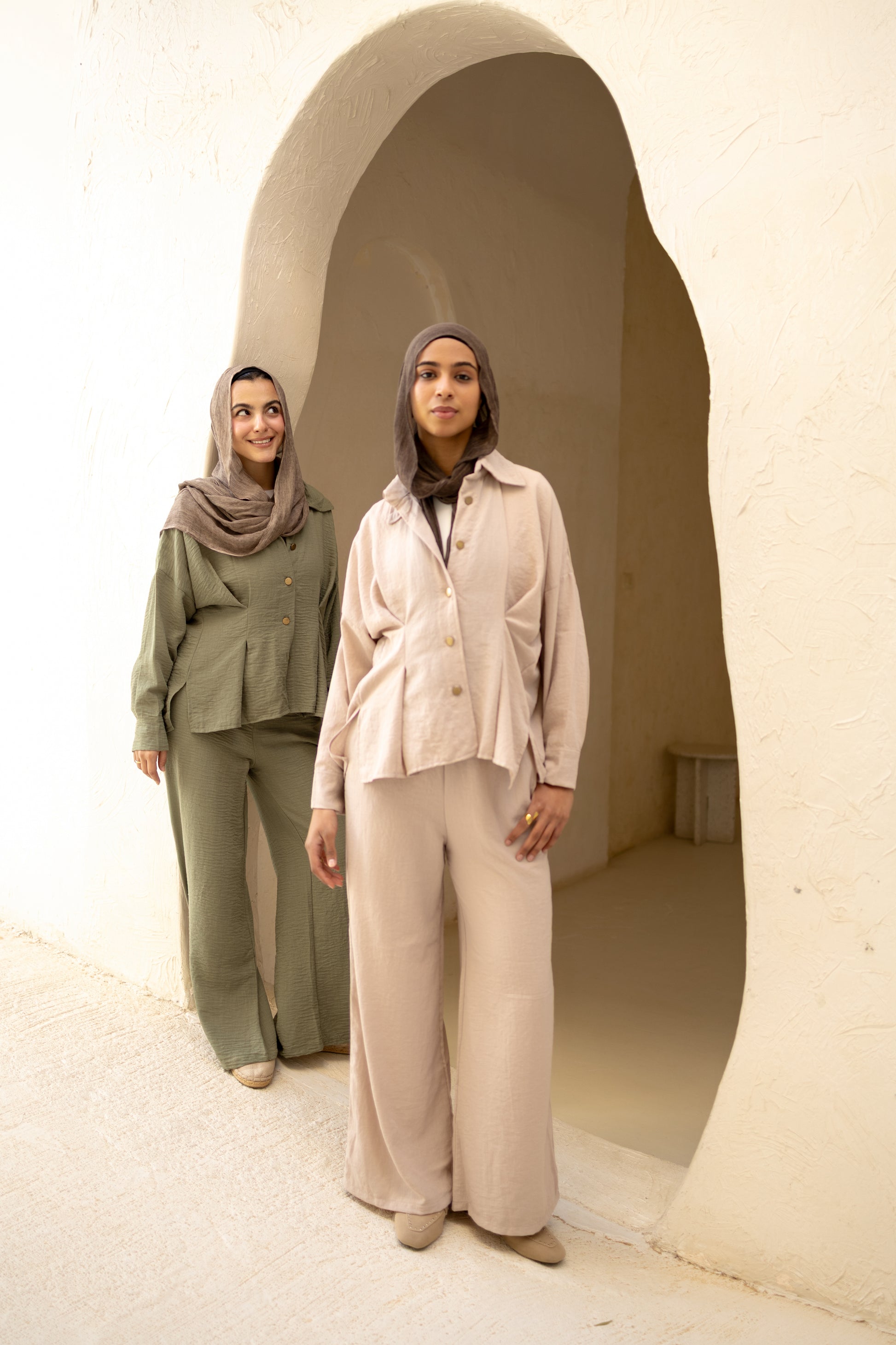 Statement Pleats Shirt Set in Beige